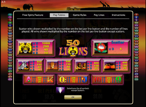 50 Lions – игровой автомат, который познакомит игроков с миром животных, а еще поможет насладиться увлекательной игрой. Слот наделен красивым оформлением, удобным интерфейсом и простыми правилами. Для увеличения призов в нем имеется бонусный раунд, игра на удвоение и знаки с особыми возможностями.