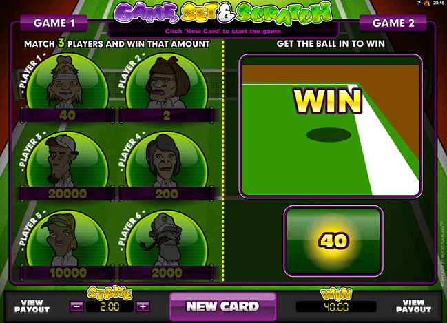 Обычно виртуальные лотереи состоят только из одного раунда, но Game, Set and Scratch включает 2 обязательные игры. Игровое поле также поделено на 2 части. В одной из них проходит основной розыгрыш, во второй – дополнительный.