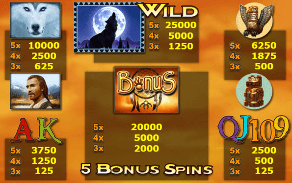 В автомате Wolf Moon есть два символа с особыми возможностями. Один из них выполняет функции вайлда, другой – скаттера. Роль дикого символа в слоте играет изображение белого волка, воющего на луну. Символ разброса представлен картинкой с изображением ловца снов и надписью «Бонус». Если на поле выпадет 3, 4 или 5 таких изображений, активируется раунд из 5 бесплатных вращений. Продлить фриспины в слоте Wolf Moon не удастся.