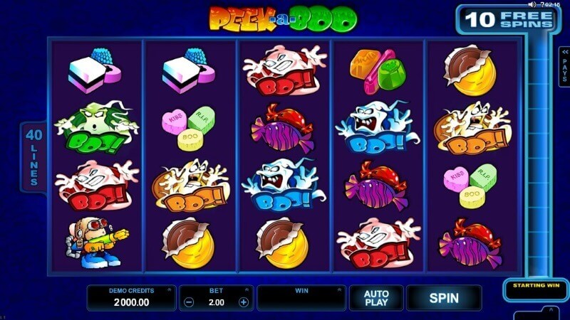 Игровой автомат Peek a boo отличается интересной тематикой и тщательно выполненной графикой. Необычное сочетание большого количества сладостей со злобными призраками придает игре особый шарм. Бонусный раунд с более чем тысячью выигрышными комбинациями позволит игроку не остаться с пустыми руками. Необычное решение в оформлении символов создает впечатление просмотра интересного и захватывающего мультика.