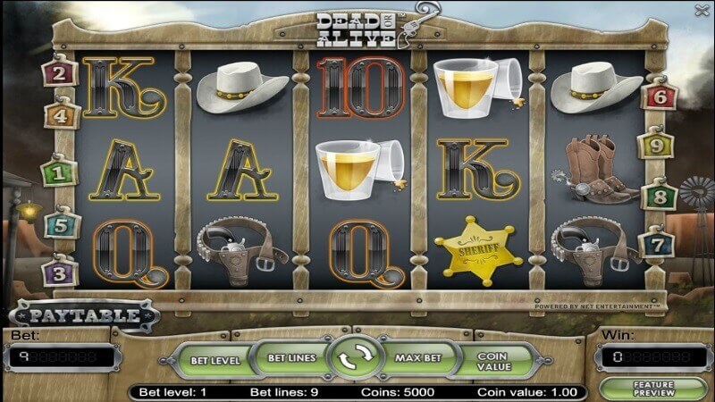 В арсенале Dead or Alive присутствуют пять барабанов, 12 тематических символов и 9 линий выплат. На каждую линию принимается ставка в размере от 1 до 4 монет номиналом 1, 5, 10, 25 или 50 центов. На одно вращение можно поставить до 36 монет. Максимально возможная ставка – 18 долларов. Выигрышная комбинация состоит из цепочки 3-х или более одинаковых символов на соседних барабанах. Рискованная игра в Dead or Alive отсутствует, поэтому сумма выплат автоматически зачисляется на счет игрока.