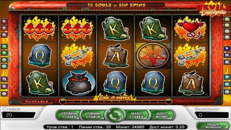 Devils Delight – онлайн-автомат от известного разработчика программных платформ НетЕнт. Перевод с английского – «Дьявольский восторг». Призовые цепочки формируются на 20-ти активных линиях, которые расположены на 5 игровых барабанах. Сумма выигрыша зависит от размера ставки – чем она выше, тем больше прибыль. Максимальная ставка составляет 200 кредитов.