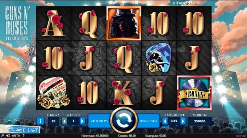 Интерфейс автомата понятен даже неопытному игроку. На панели управления все кнопки стандартные. Исключением является Set List. Она позволяет выбирать песни группы Guns N Roses. Можно также найти и русифицированною версию Guns N Roses. Слот доступен в демо-версии, а значит бесплатно и без регистрации. Играть можно и на ПК, и на мобильных устройствах.