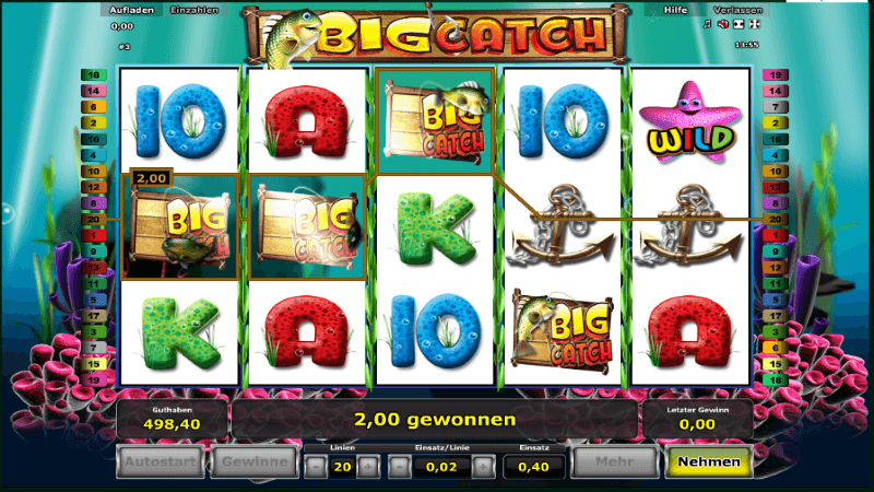 Онлайн-слот Big Catch – продукт производителей игрового софта Novomatic. Игра предлагает гэмблеру словить самые прибыльные знаки на крючок, увеличив свой бюджет на крупную сумму. Игровое поле оснащено пятью барабанами и имеет 20 линий выплат, формирующие выигрышные комбинации. Помимо стандартного сбора знаков, пользователь может участвовать в бонусных раундах, риск-игре и т.д., где разыгрываются множители суммы и прочие награждения. Тематическое морское оформление слота Big Catch, музыкальное сопровождение и качественная анимация способна настроить игрока на получение максимальных выигрышей